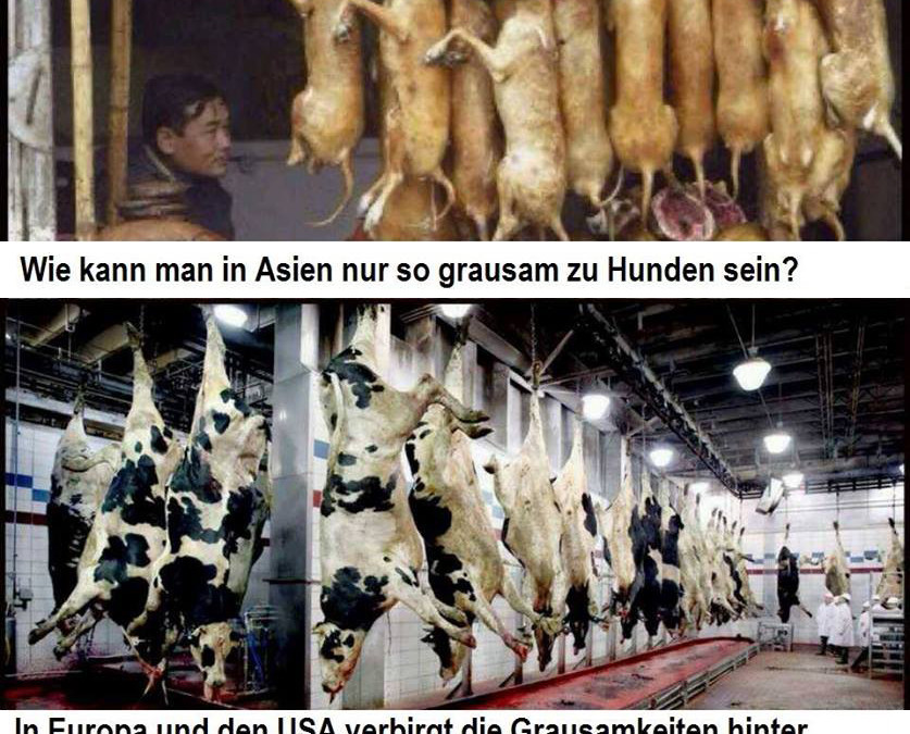 Wer Tierqualprodukte konsumiert und seine Haustiere damit füttert, ist nicht besser als die Asiaten, die Hunde und Katzen konsumieren.